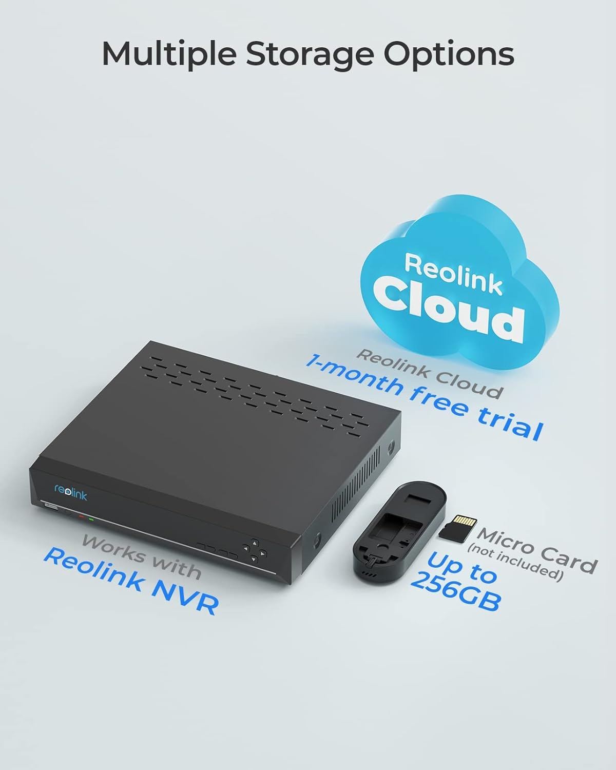 - خيارات تخزين مرنة: يدعم تسجيل الحركة الأمامية التي توفر مواد قيمة لمدة 6 ثوانٍ قبل الحدث. يمكن تخزين التسجيلات على بطاقة مايكرو اس دي (بحد أقصى. 256 جيجابايت، غير متضمنة)، ريولينك ان في ار أو ريولينك كلاود.