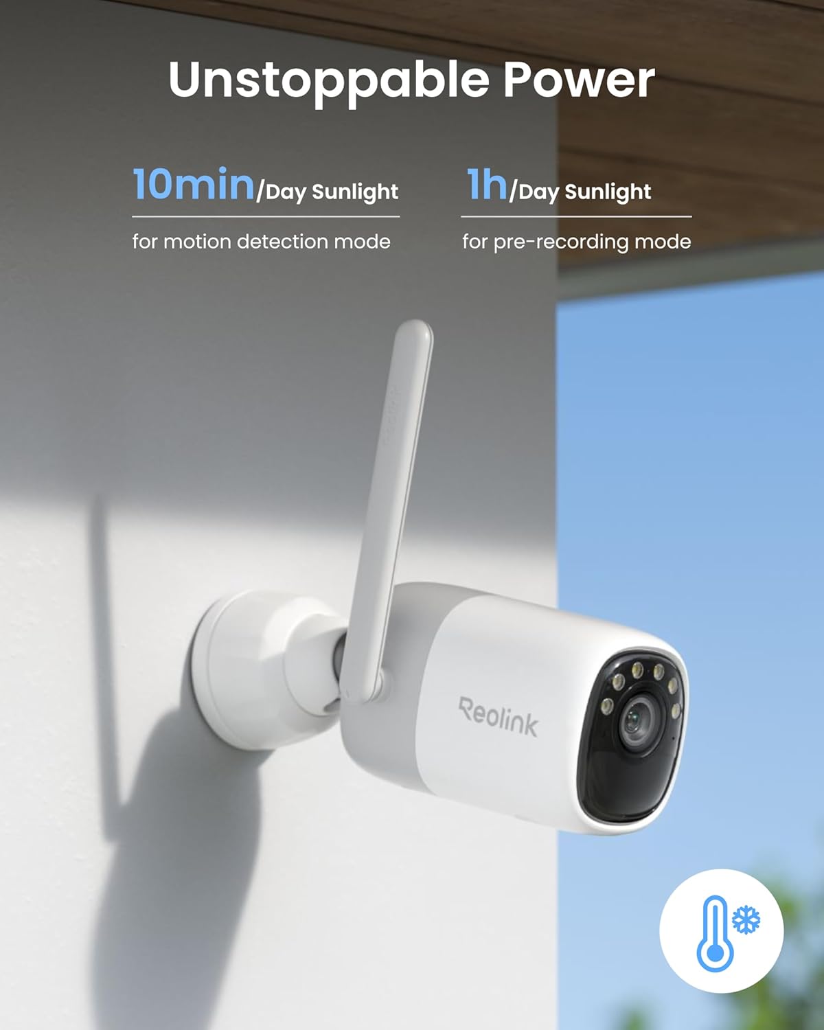 - بطارية ضخمة تدوم طويلاً: مع ما يصل إلى 14 يومًا من التسجيل المتواصل بشحنة كاملة، وما يصل إلى 540 يومًا في الوضع القياسي، تتحمل كاميرا Reolink Altas الأيام الممطرة والشتاء. تعمل في درجات حرارة منخفضة للغاية، تصل إلى -20 درجة مئوية، مما يضمن استمرارية أمنك دون انقطاع.